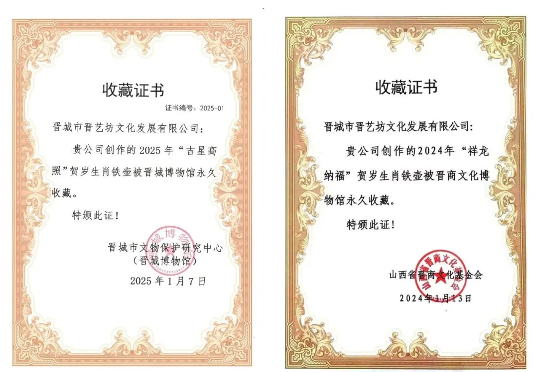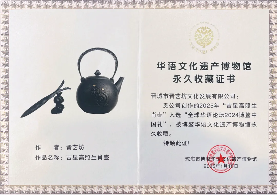 2025晋艺坊《吉星高照》生肖壶入选为博鳌国礼依次被晋城博物馆、晋商文化博物馆,博鳌文化遗产博物馆收藏。