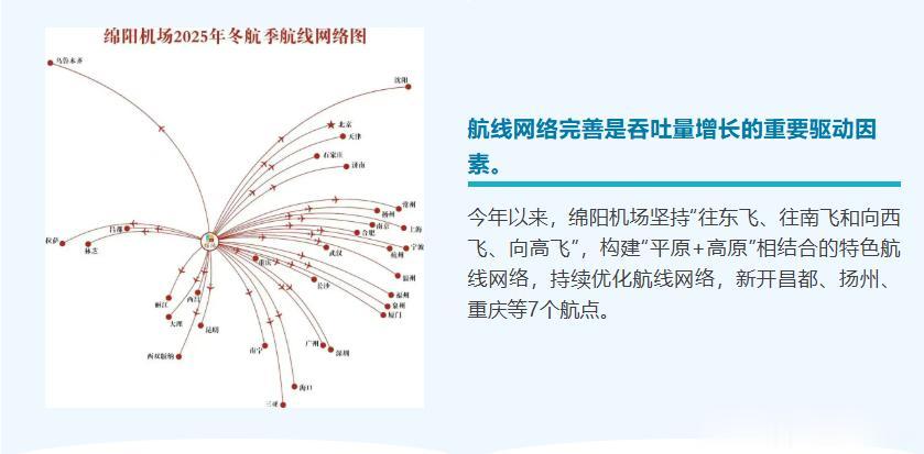 避其超大机场的锋芒,坚持“往东飞、往南飞和向西飞、向高飞”的航线布局,并强化自己的比较优势,构建绵阳“平原+高原”相结合的差异化特色航线网络。在现有航点能满足基本航空出行需求,先从有到密再到优的方向不懈努力,不断优化乘客出行需求。终于交出了漂亮的答卷。
