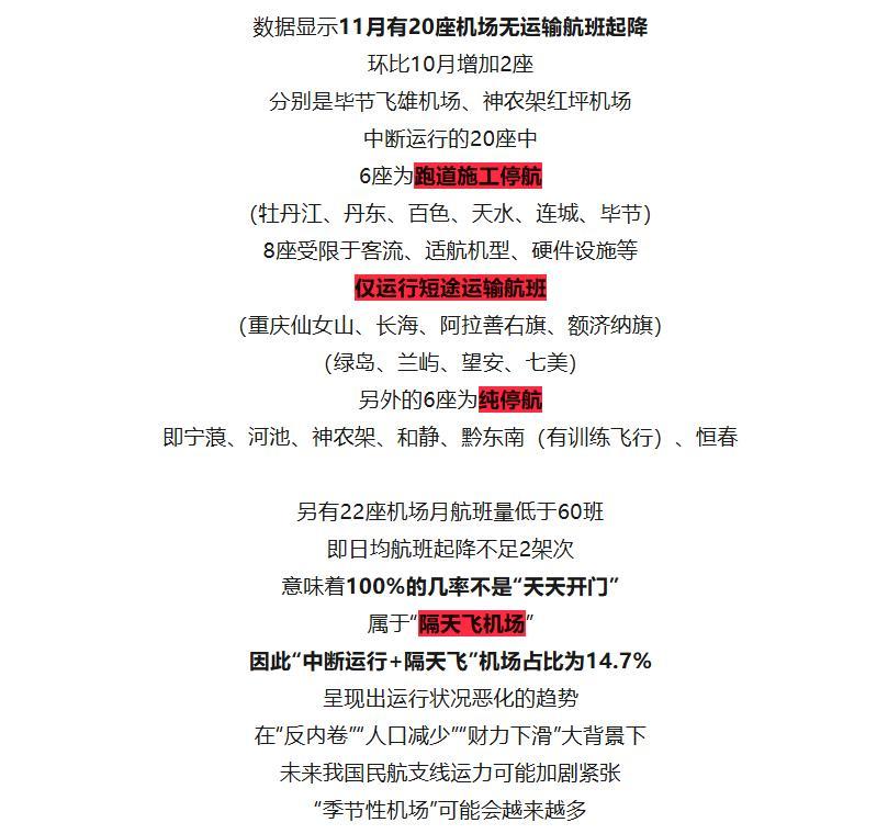 据相关报道,在全国285个机场中,有20个机场彻底陷入停航状态,另有18个机场日均起降不足2架次,相当于无法保证每天都有航班运营。