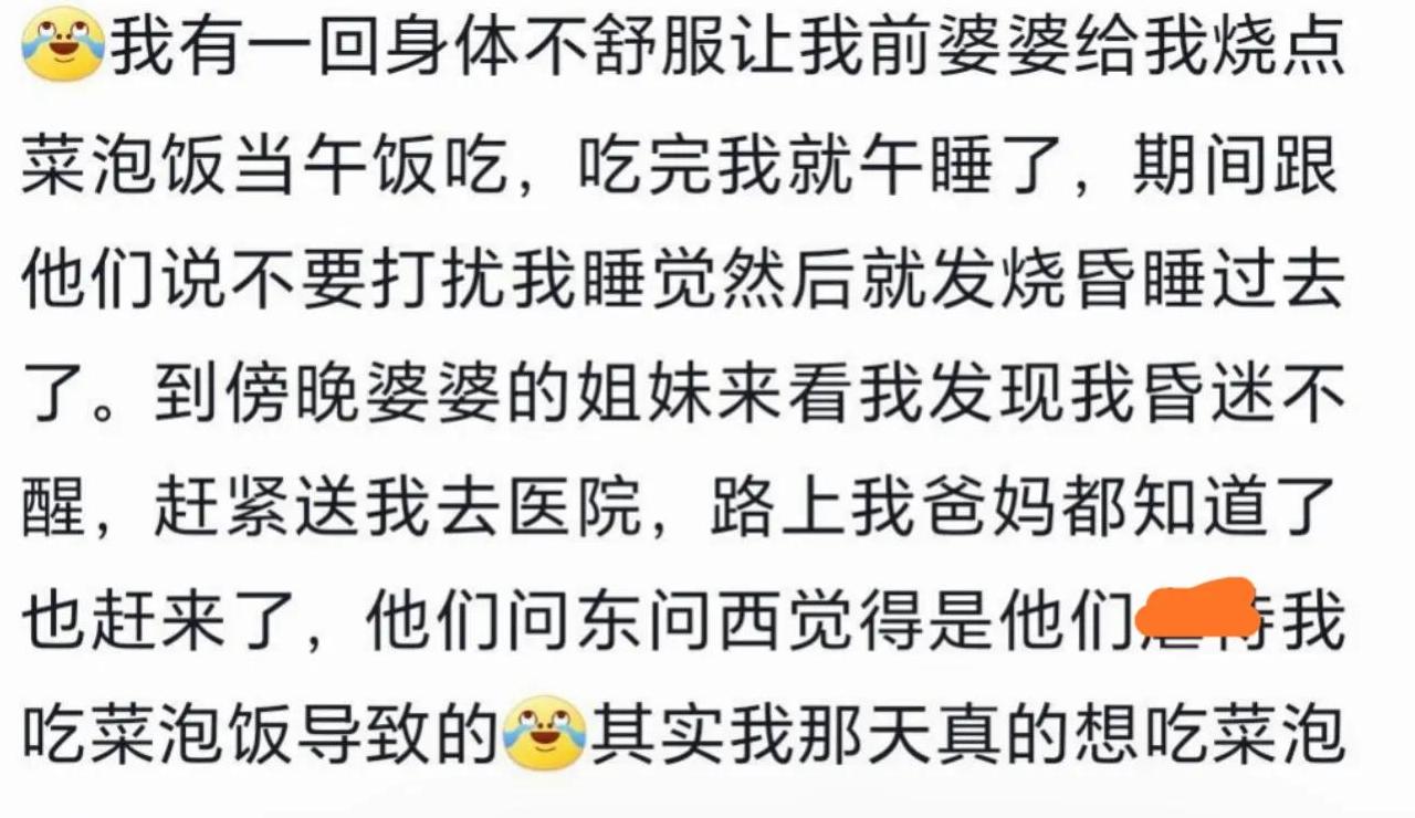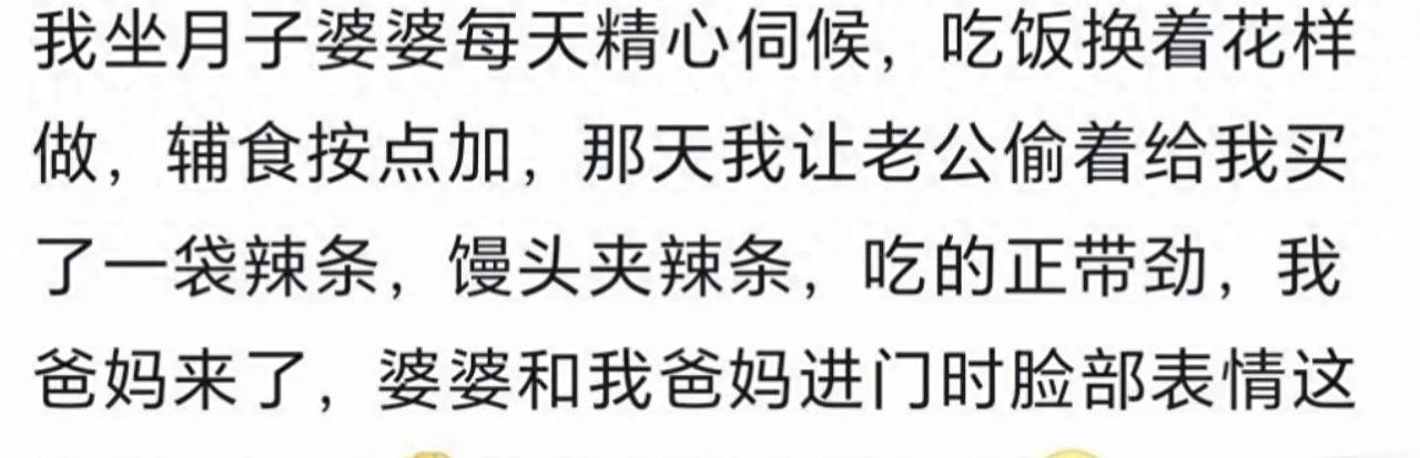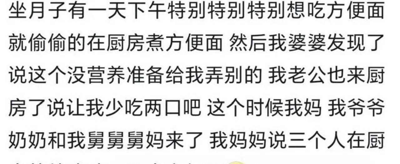 还有一次,我坐月子时特别想吃泡面,婆婆妈悄悄给我炖汤,怕被发现我偷偷叫老公送泡面,一不小心被爸妈看到,那场面尴尬得让我至今难忘。