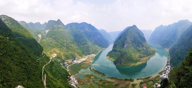 登上观景台,后放眼望去,视野开阔,心旷神怡,只见红水河在这里拐了个U形的非常完美的河湾,河湾中间是几座耸立的高山,河水清悠墨绿,河湾旁还有几块黄绿相间的田地,景色非常别致,美得不可思议,令人感叹和震撼。