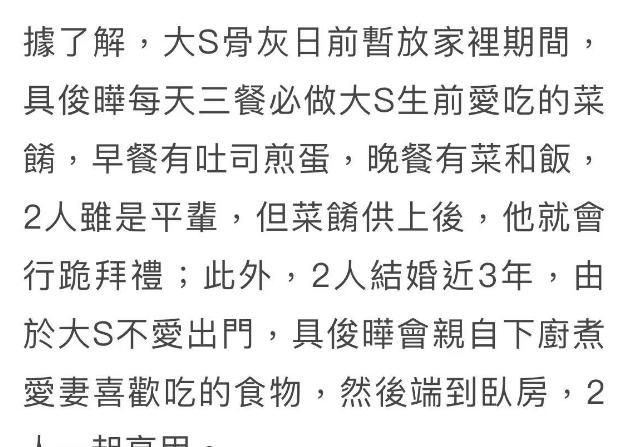 自从大S去世后,他寸步不离地守着她,每天都会为她做她生前爱吃的菜肴,还会进行跪拜礼,表达他对爱妻的无尽思念。