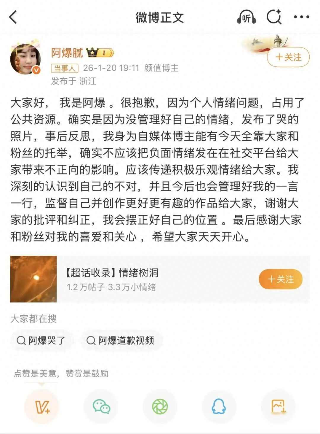两天后她修改了文案,说是因为照片好看才发出来,接着又开直播解释,想展示那种破碎的感觉,可是越解释越让人糊涂,视频先设为私密再公开,评论也关掉,最后干脆删除了,这些动作太多,反而让人觉得她在躲避什么,1月20号晚上七点多,她发出道歉,说占用了公共资源,没有管好自己的情绪。