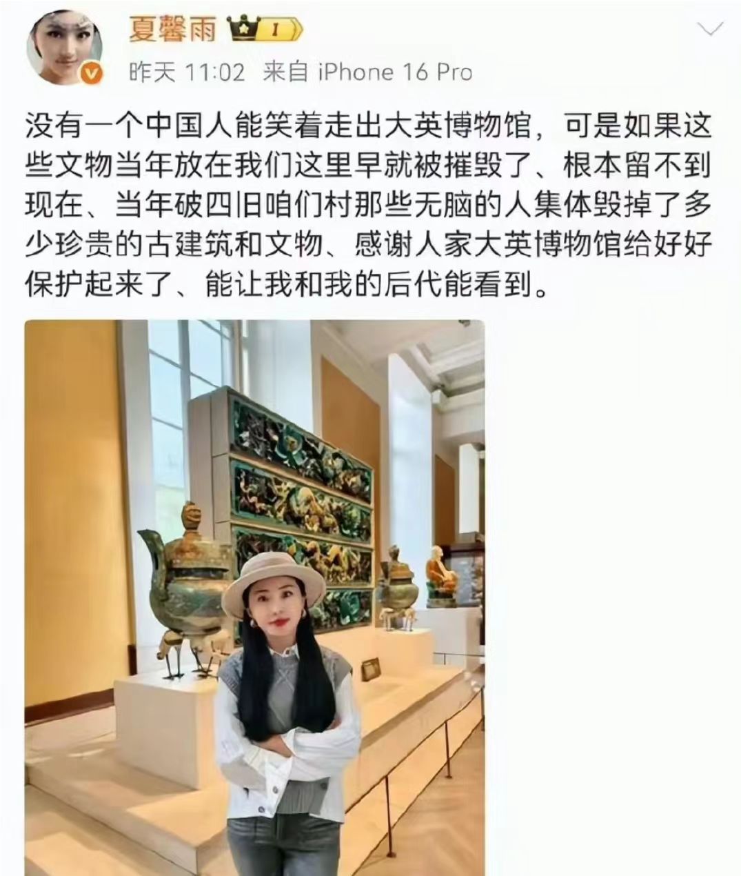 38岁的女演员夏馨雨近期因社交媒体言论引发巨大争议。她参观大英博物馆后发文:“没有一个中国人能笑着走出大英博物馆”,紧接着就补充:“如果这些文物当年放在我们中国,早就被毁掉了”,认为正是因为有了大英博物馆,文物才能保留到现在,并直言感谢大英博物馆的“保护”。