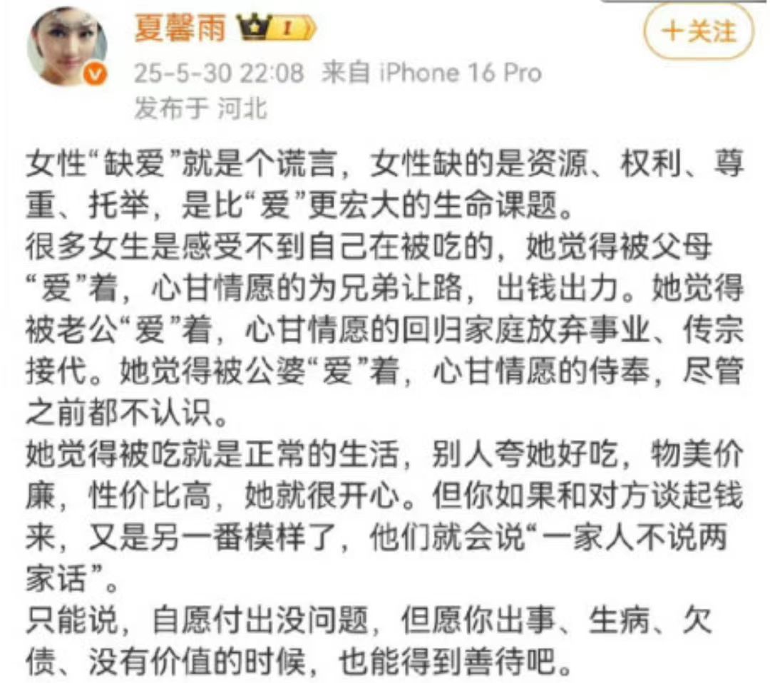此外,网友还发现夏馨雨曾以“38岁未婚”为傲,并在社交媒体上多次发表涉及“自由”“奴性”“女性”等敏感言论。有网友分析,她的言论看似“独立思考”,实则观点片面与偏激。