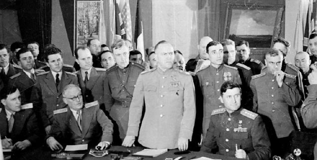 1945年5月8日,朱可夫在柏林郊外主持了纳粹德国无条件投降仪式,并代表苏联签字。
