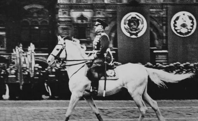 1945年6月24日,在胜利大阅兵中,朱可夫作为阅兵首长,骑着白色战马,走在队伍最前,检阅了苏联红军陆,海、空三军,达到了人生事业的顶点。