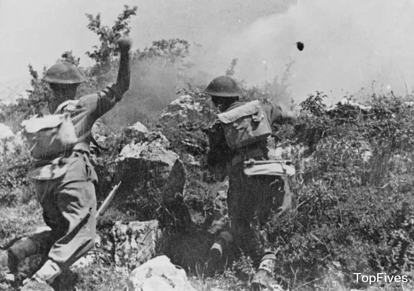 在卡西诺山战役期间,波兰第二军团的士兵在猛烈的抵抗下,使用手榴弹和步枪火力猛攻德军阵地,奋力推进。