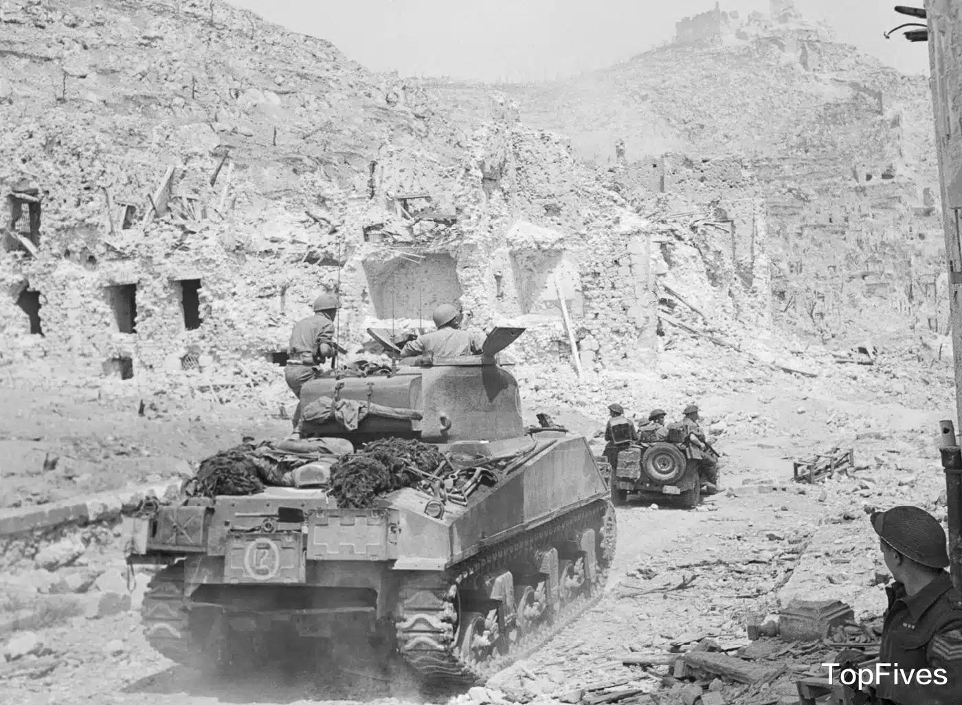 新西兰第四装甲旅的 M4 谢尔曼坦克驶入卡西诺山修道院的废墟。盟军突破古斯塔夫防线是意大利战役中的关键一役。
