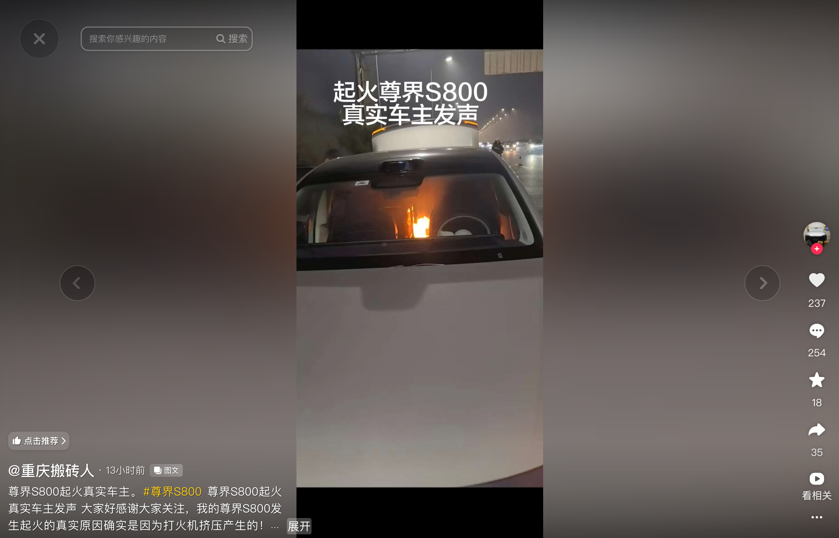 1月23日,该尊界S800车主“重庆搬砖人”在社交媒体平台展示消防救援支队出具的火灾事故简易调查认定书,公开回应此事。“重庆搬砖人”表示,“尊界S800发生起火的真实原因确实是因为打火机挤压产生的”。