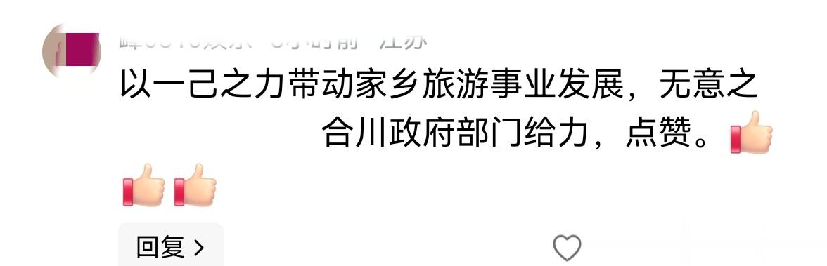 还有网友夸赞创作者以一己之力带动了家乡旅游,还点赞了合川政府部门的给力支持。我觉得这确实是意外之喜,也算是善意带来的正向回馈。