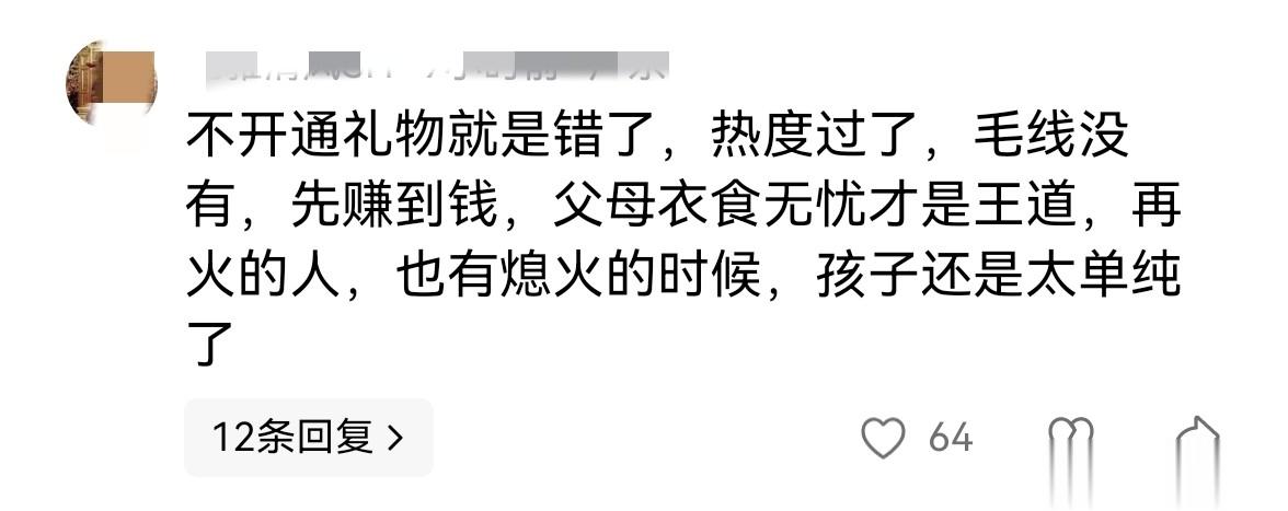 有网友认为创作者不开通礼物功能是错误的,热度过去就没收益了,应该先赚钱让父母衣食无忧,觉得孩子想法太单纯。我觉得这话说得挺现实,但也忽略了创作者自己的初心。