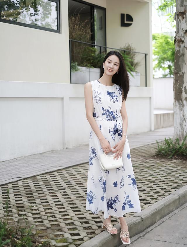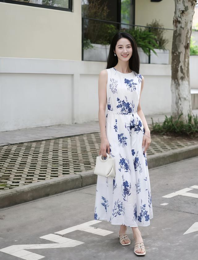 先说说这条裙子的样子哈,底色是白色的,看着很清爽,也很单纯呢,就跟夏天里那片干净的天空似的,能让人感觉到轻快和舒畅。上面还装饰着蓝色的花卉图案,就跟慢慢展开的莫奈花园的画一样。每一朵花都活灵活现的,有的特别艳丽,招人喜欢,有的则含蓄地准备开放,它们和白色底色相互搭配着,看起来特别协调、美妙。穿上它呀,就仿佛一下子来到了莫奈的花园里,变成了那个在花丛中悠闲行走的优雅女子。