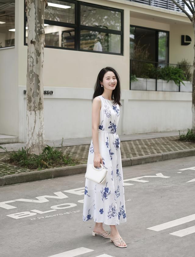 在配饰方面,配上一个草编的包和一双凉鞋,瞬间就透出了一种懒散的味道,这个时候又充满了随便自在的感觉。草编包的质朴和凉鞋的随性,与蓝白印花长裙的优雅相得益彰,让整个造型更加和谐统一。
