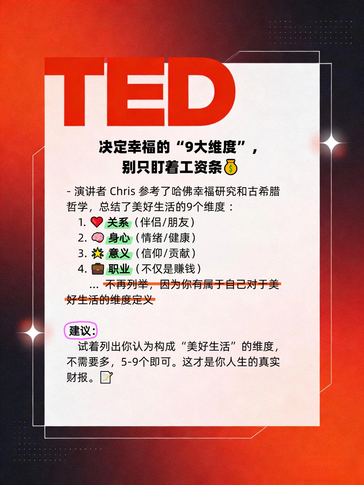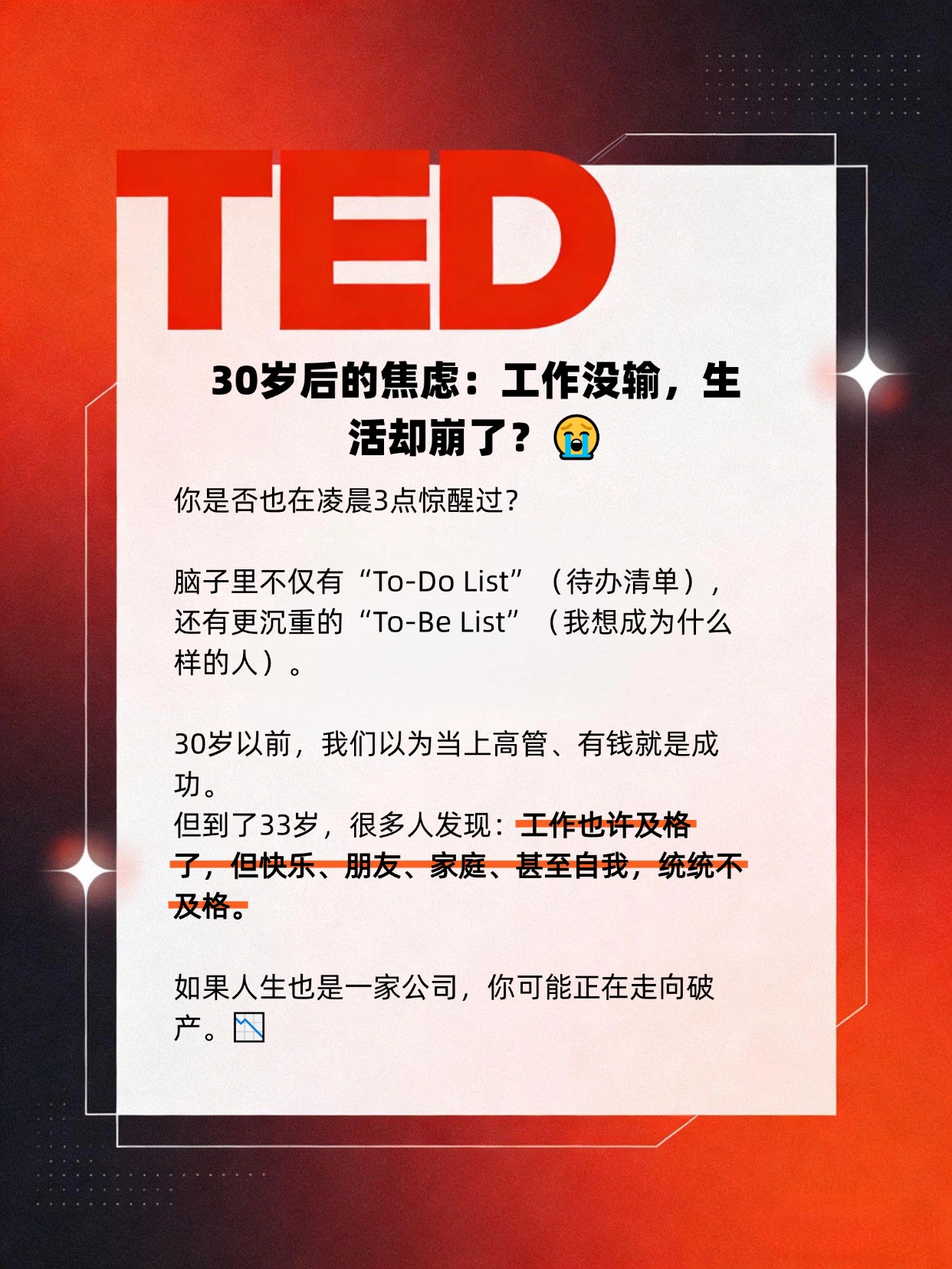 今天分享一个超级实用的TED演讲,演讲者Chris是一个典型的“焦虑型”咨询顾问。他在33岁时意识到,自己虽然表面光鲜,但内心并没有“蓬勃生长”(Thriving)。🌱