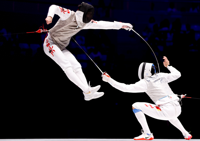 9月24日,杭州第19届亚运会男子个人花剑比赛在杭州电子科技大学体育馆举行,中国队陈海威(右)战胜中国香港队蔡俊彦晋