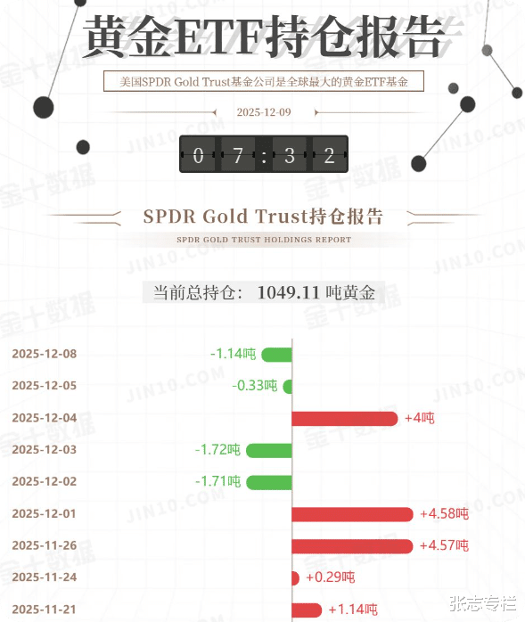 全球最大黄金ETF--SPDR Gold Trust持仓较上日减少1.14吨,当前持仓量为1049.11吨。