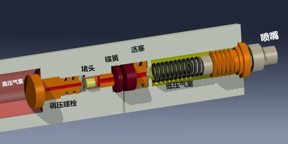 动态过程:在实际运行中,低压气室的压力会随着气体的消耗而下降。当压力低于碟簧的压缩力时,活塞会向低压气室方向移动,重新打开进气通道,补充高压气体,维持压力稳定。这一过程是动态的,活塞会根据低压气室的压力变化实时调整位置。