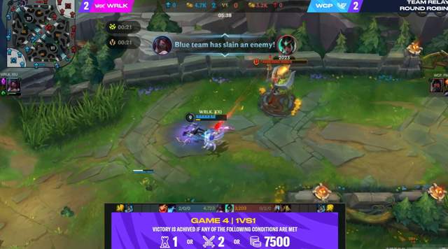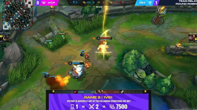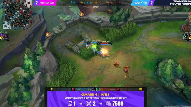第一局SOLO赛,WCP这边派出了Pacheco,WRLK则是再次派出了You。Pacheco选择了狼人,You则是选择了鳄鱼。前三分钟对线,双方可以说是不相上下,但是3分钟之后,场上的局面开始变化,You打的非常凶悍,更是经常把Pacheco的狼人消耗回家,自己则是迅速积累经济。而之后有趣的是,WCP的选手眼看已经没有办法赢下比赛,便一直在发表情与You选手互动。最终,You则是以7500的经济拿下了第一局比赛的胜利。