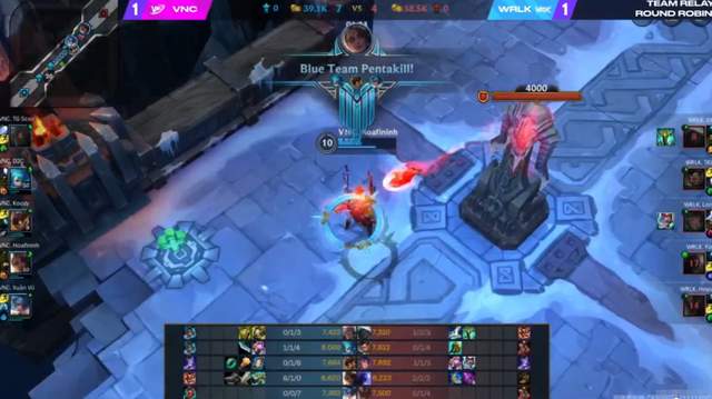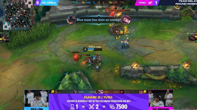 第二局比赛,VNC派出了Hoafininh,他选择了剑姬;WRLK派出了Long,选择了兰博。比赛开始没多久,就能够感受到Long兰博的熟练度非常高,不仅操作非常细腻,细节把控也很出色。在3分钟左右的时候,Long就利用对手的失误拿到了“一血”,而在拿到“一血”之后,Long并没有给到Hoafininh机会,凭借着等级与装备的优势,完成越塔“击杀”,成功拿下这局比赛的胜利,WRLK扳回一城。