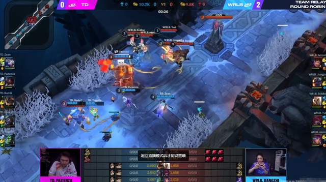 比赛开始,双方就将“打架”进行到底。双方你来我往,一直到比赛时间10分钟左右,双方“人头数”与经济都是相当接近。虽然比赛来到后期,拥有天使的WRLK看起来更有优势,但是WCP这边的机器人在关键团战中钩到天使,一锤定音。WCP则是在符文大乱斗中拿下一场胜利。