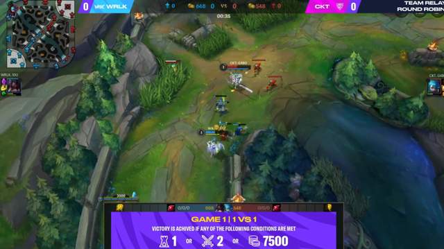 第一局比赛,CKT派出了G4BO选手,WRLK则是派出了XXJ。他们分别拿出了格温与阿卡丽。选出这两个英雄,自然是冲着“击杀”去的。不过,G4BO选手打的非常谨慎,并没有给到XXJ“击杀”的机会。在这样的情况下,XXJ并不着急,凭借着自己扎实的基本功,在经济上始终处于领先。在经济领先的情况下,XXJ多次凭借着阿卡丽精彩的操作经常把G4BO选手的格温打回家。最终,因为多次回城,XXJ轻松拆掉了一塔,为WRLK拿下了第一局比赛的胜利。