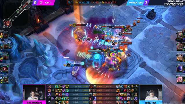 而在SOLO赛过后,就是CKT与WRLK的符文大乱斗。这局比赛CKT选到了猴子、劫、维克托、女枪以及泰坦;WRLK则是选到了炼金、腕豪、天使、瑞兹以及萨勒芬妮。从阵容上来看,明显还是CKT前期的爆发力更高,不过WRLK这边却拥有着很强的中后期团战能力。