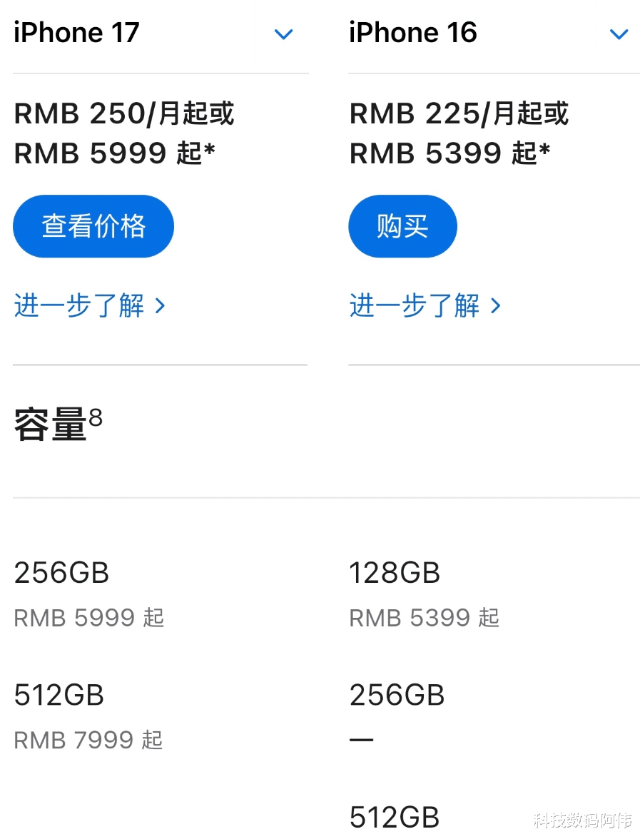 iPhone 17标准版,在存储翻倍、屏幕大升级的情况下,起售价竟然维持在5999元(国补后预计5499元),真正做到了“加量不加价”。 这让花了6799元才买到256GB版iPhone 16的用户情何以堪?“买16真不如等17”成了大家一致的呼声。