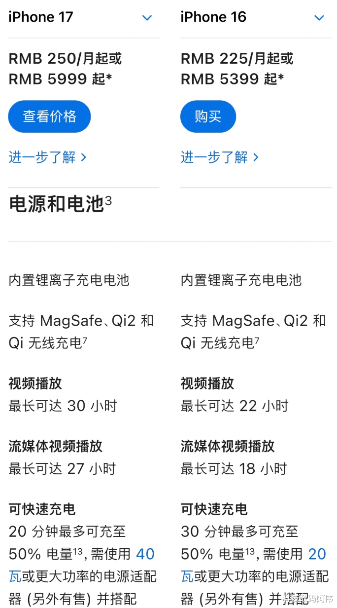 其次,是充电速度的断层式碾压。 iPhone 16用户可能还在为“终于支持30W充电器”而稍感欣慰,但实际稳定功率只有20-25W,半小时充一半电的速度,在如今的手机市场只能算“佛系”。而iPhone 17呢?峰值快充直接拉到35W,搭配40W充电器,官方宣称20分钟就能充到50%。 这33%到50%的效率差距,对于电量焦虑的用户来说,是实实在在的体验鸿沟。