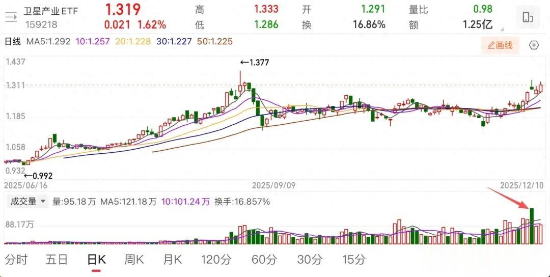 跟踪中证卫星产业指数的头部场内ETF,卫星产业ETF(159218.SZ)这几天持续放量上涨,成交额在周一还创了历史新高。