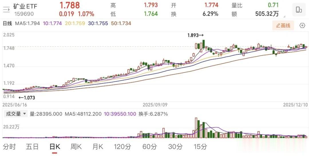 跟踪中证有色金属矿业主题指数的矿业ETF(159690.SZ)横盘震荡一个多月了,如果再来一波强催化,可能会冲破箱体,走出新一波行情。