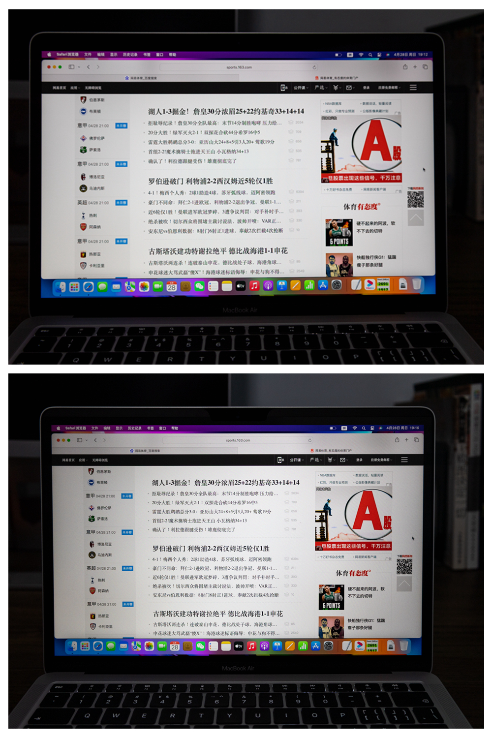 如下图,是同样亮度下,正面观看笔记本屏幕的对比图。