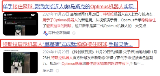 另外,特斯拉人形机器人也传出重磅的利好。 11月28日,特斯拉再次展示了Optimus机器人稳稳接住迎面抛来的网球并放下的视频。