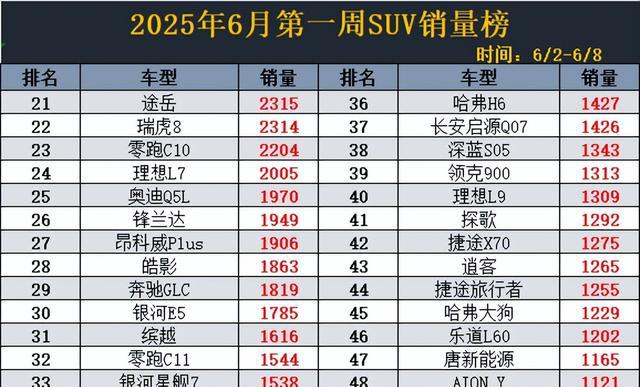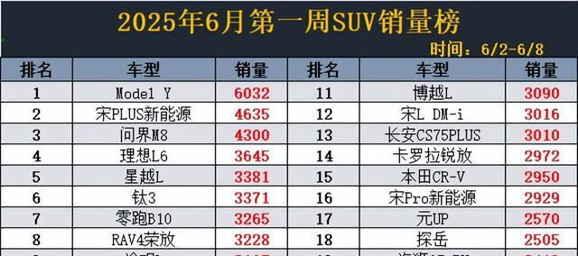 数据显示,2025年6月第一周的SUV销量榜中,特斯拉的Model Y虽然环比骤降41%,依然保持市场销售的绝对领先地位。这一现象引发了诸多疑问:在如此大的销量下降下,Model Y凭什么依然屹立不倒?其他新势力品牌如问界、零跑等又是如何快速崛起,跻身榜单前列的?不妨一窥这背后的奥秘。
