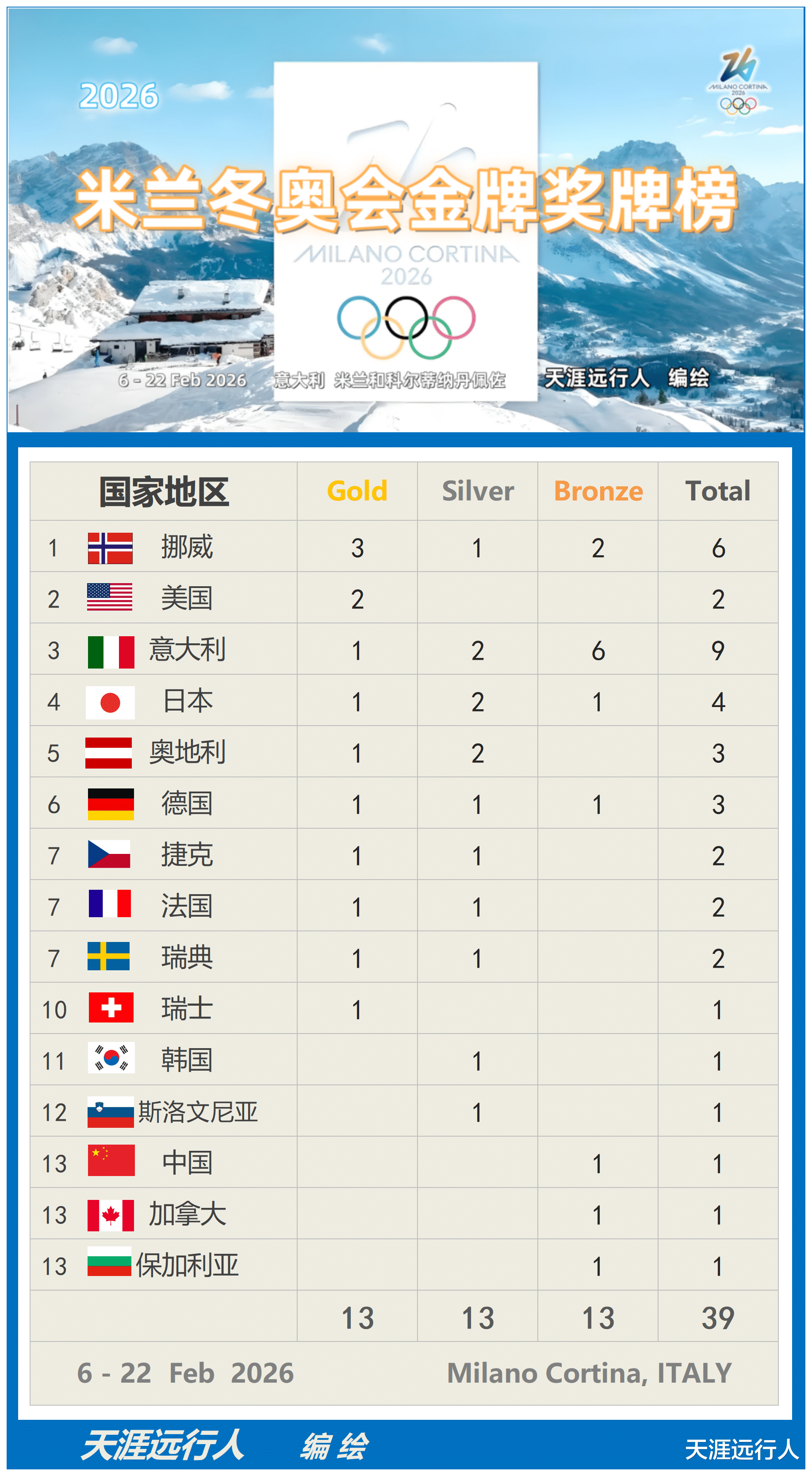2026米兰冬奥会奖牌榜