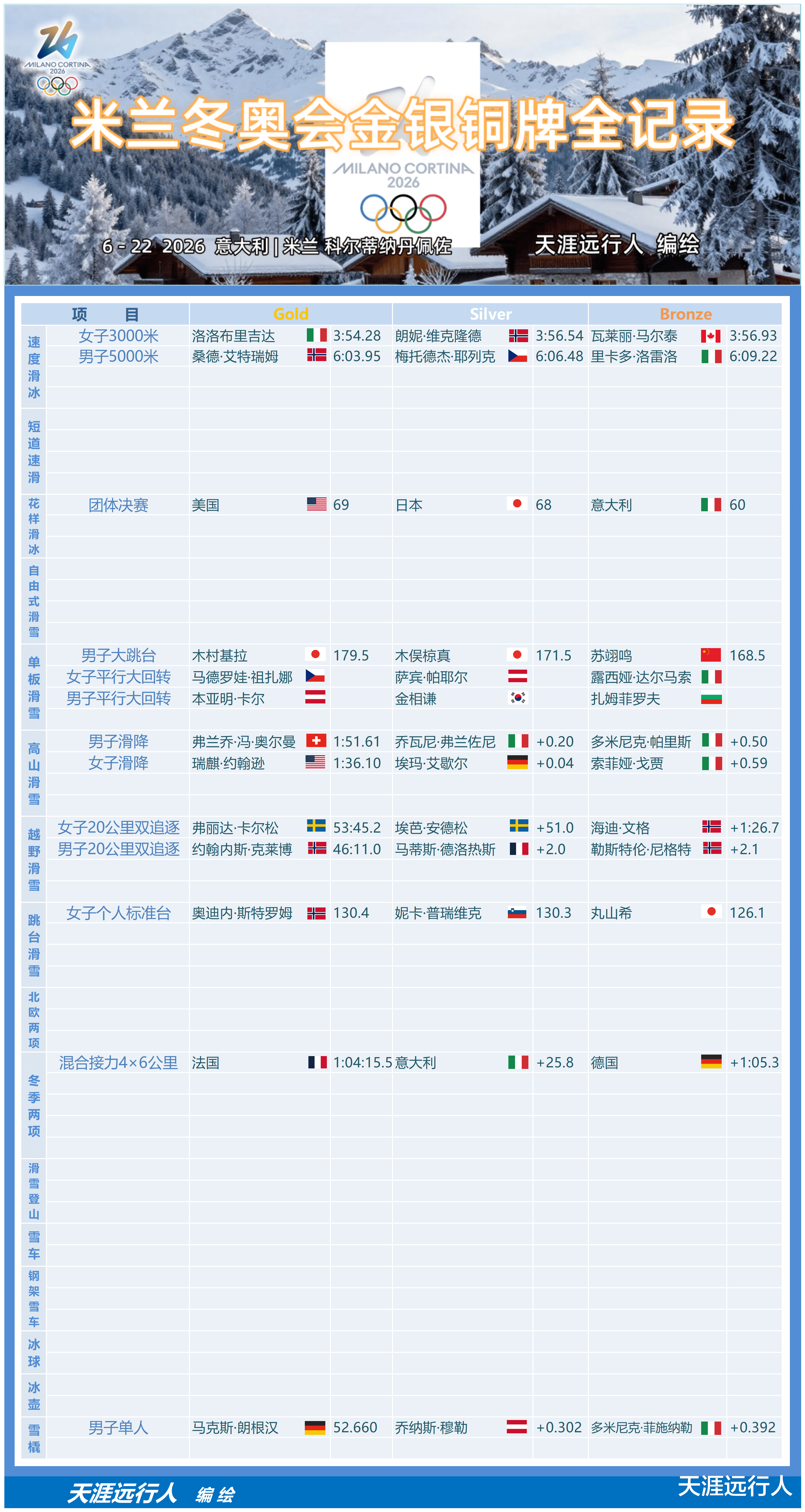 2026米兰冬奥会金银铜牌全记录