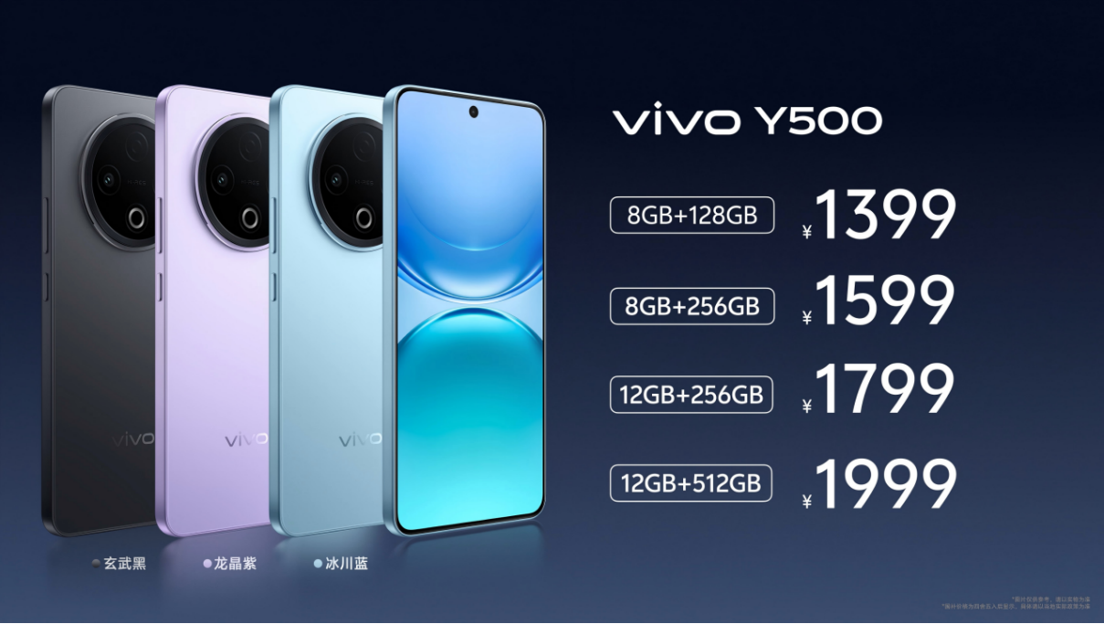 全新vivo Y500提供四种容量版本供选择,8GB+128GB版本售价1399元、8GB+256GB版本售价1599元、12GB+256GB版本售价1799元、12GB+512GB版本售价1999元。