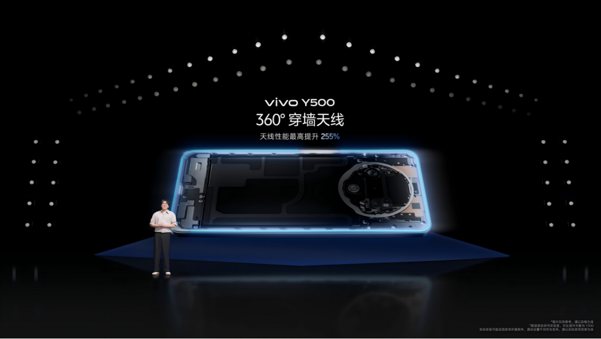 通信能力是vivo Y500的另一大亮点:突破性的360°穿墙天线布局,将多达20根天线布满整个中框,使整体信号接收最高提升255%。通过AI网络智选功能,vivo Y500可在电梯、地库等弱网场景下切换至更好的网络信号,且通过了国家无线电监测中心认证,信号能力达到五星级。