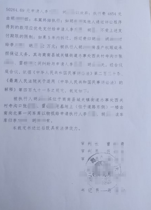 胡某楠、裴某襄、李某漫三人因交通事故赔偿一案,此次交通事故经f院判决胡某楠需分别赔偿李某漫、裴某襄家属各33万元。因无力支付现金,商南县f院执行局执行f官曹某勇未经评估强行,强迫胡某楠的父亲分别以一间门面房22万元价格以物抵债给李某漫家,又把商品房以22万元的价格以物抵债给裴某襄家,价格明显低于市场价,胡某楠为了履行赔偿责任,将二套房屋交给f院,此后,胡某楠又将剩余款项悉数还清,此事本应该就此终结,商南县f院执行f官重复执行该案,又将胡某楠的父亲胡先生司法拘留。二套房屋商南f院未交付给二申请人,二套房屋被商南f院执行局造成流失价值120万元,责任由谁来承担!胡先生已向商洛市j察院反映,商洛市j察院积极侦办之中,结果期待!