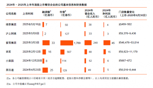2024年,茶百道、小菜园和古茗等企业成功在香港IPO;2025年,蜜雪集团、牛大人、沪上阿姨和遇见小面等成功在香港IPO;另有老乡鸡和巴奴毛肚火锅等向港交所更新招股书。