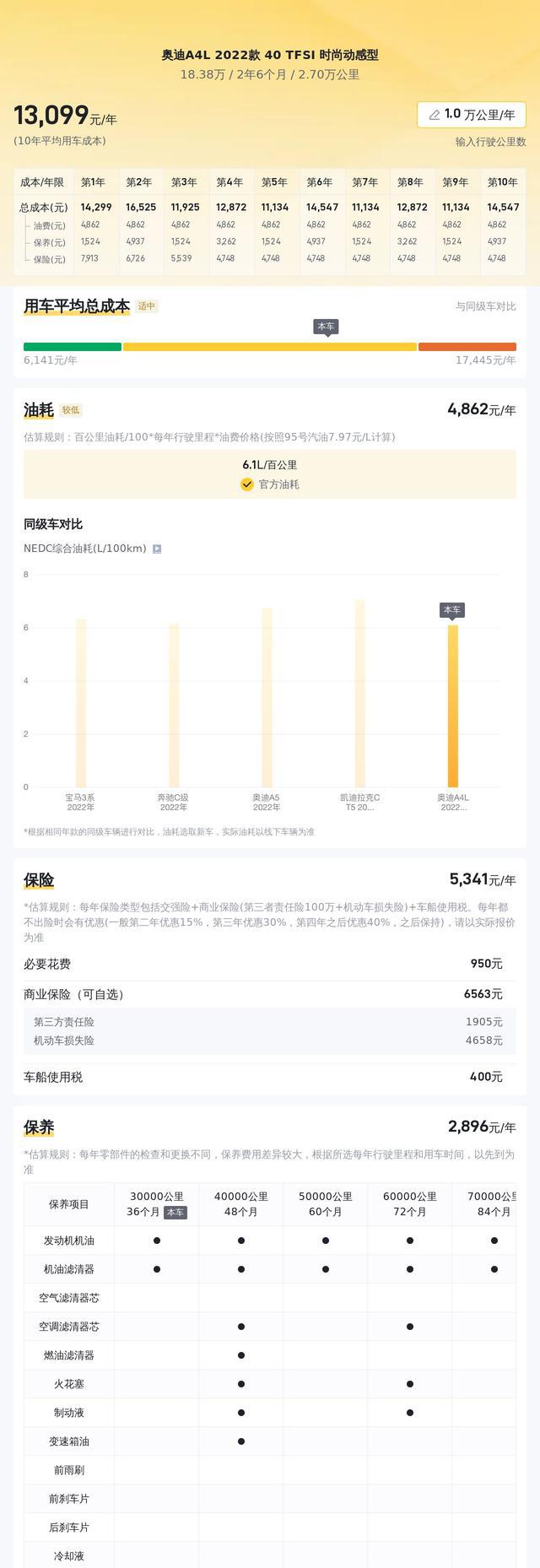 说到用车成本,这是所有车主都需要面对的一项现实问题。根据市场调研和数据分析,奥迪A4L的油耗大致在6.1L/100km左右,相比同级别的奔驰C级与宝马3系,这个数值表现尚可。同时,保险与保养费用也是消费者需要计算的项目。一辆二手奥迪A4L用车成本的计算,必须将这些要素统统考虑在内,一些车主提供的数据也表明,二手奥迪A4L的年均用车费用能够在1万元以内,比较适合年轻有为的中高端消费群体。