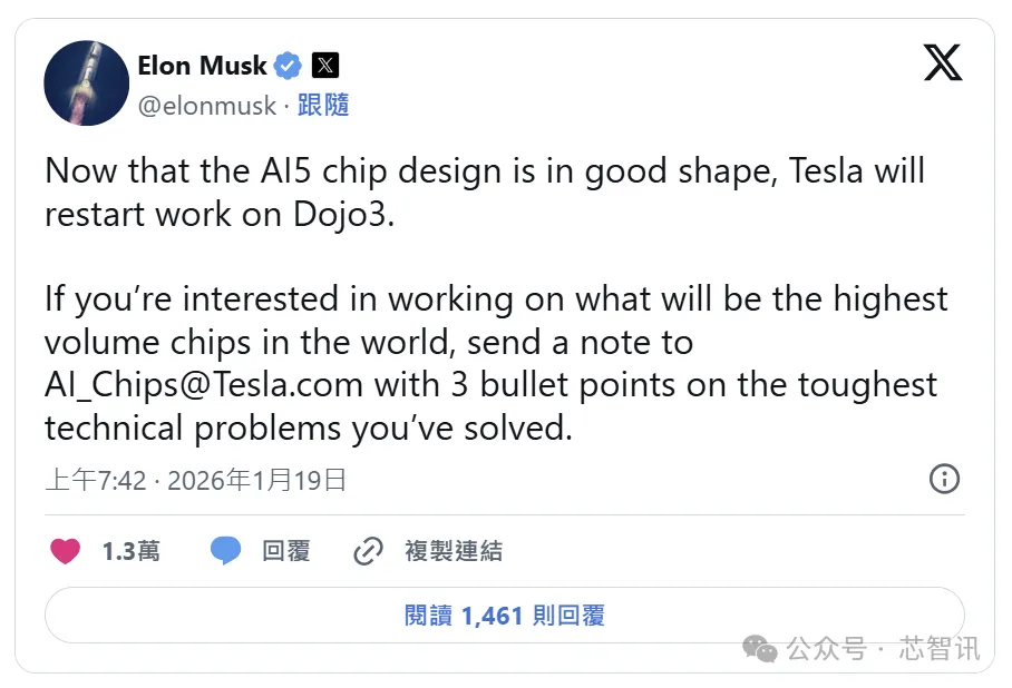 不过,马斯克最新的表态带来了转机。他明确指出,随着新一代AI5芯片设计已进入“良好状态”(in good shape),特斯拉将正式重启Dojo 3 的研发工作。这显示AI5 的成熟度直接促成了Dojo 项目的复活。