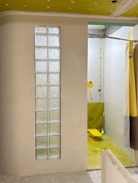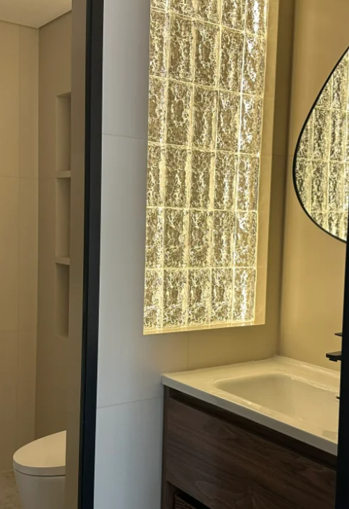卫生间的外墙如果不是实心墙的话,大家可以全都砸掉,用玻璃砖垒出一面墙,这样可以让卫生间的通风和采光更好,平时使用效果也不错。