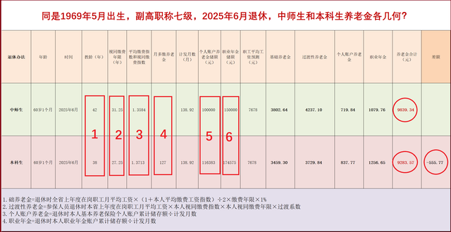 两名教师,同在一个基层学校教书,都是1965年5月出生,初中是同学,一个中师毕业1983年7月参工,一个本科毕业1987年7月教学,2014年9月30前都评聘上了副高职称,两人现在都在2025年6月退,谁的养老金高些?