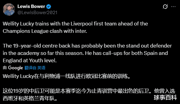 卢茨基11岁随家人搬到英国,手握西班牙+英格兰两本护照,两边青年队都征召过他,国际赛场早就证明过自己。今年10月联赛杯对水晶宫的比赛,卢茨基已上演一线队首秀。虽然那场球队输了,卢茨基却拿到了代表利物浦出战的首次正式比赛履历。这次被叫进欧冠备战,等于又往“常备名单”迈出了一步。
