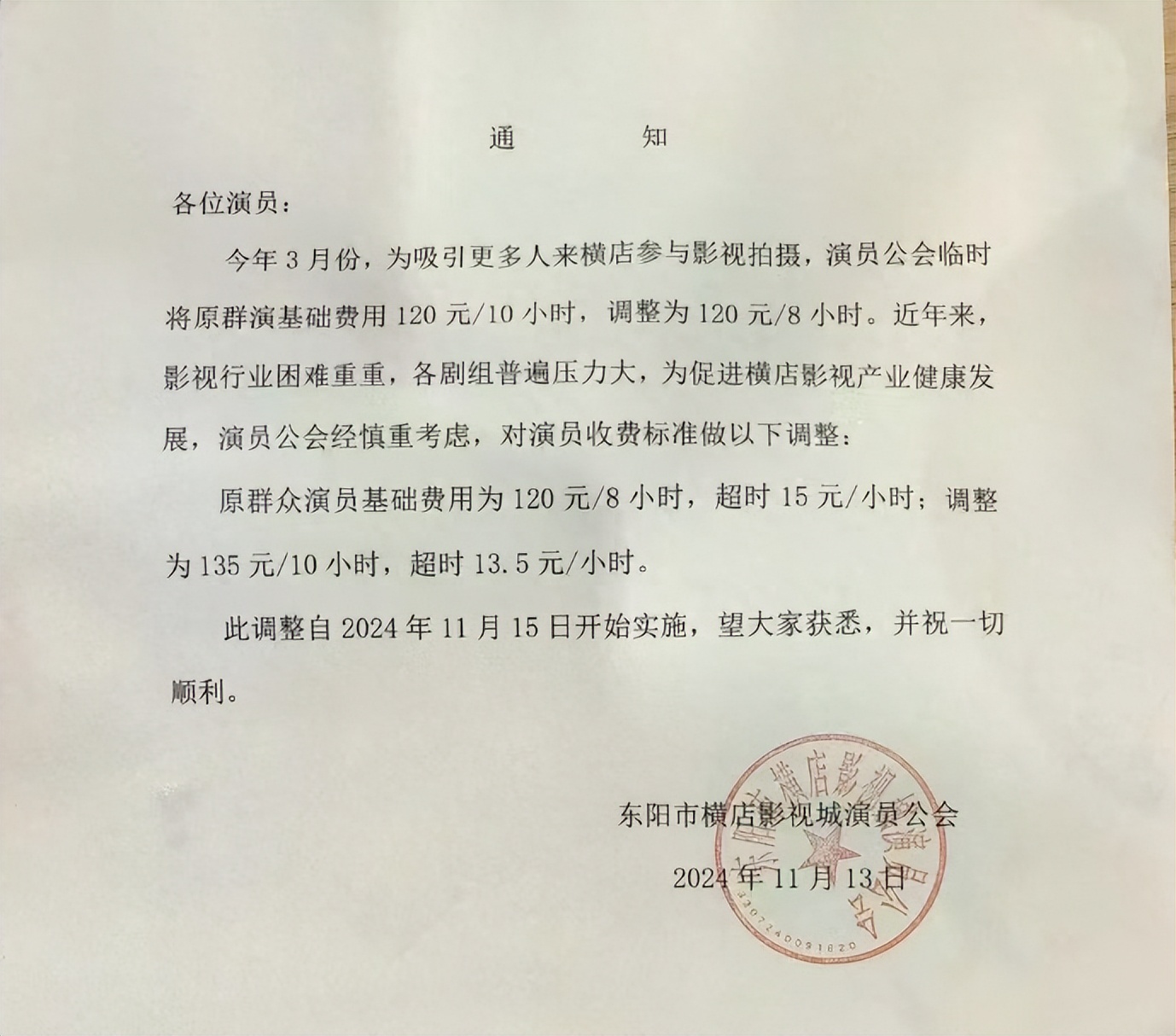 根据横店影视演员公会发表的一则公告来看,自 2024 年 11 月 15 日起,群众演员基础费用调整为 135 元 / 10 小时,超时费用为 13.5 元 / 小时。