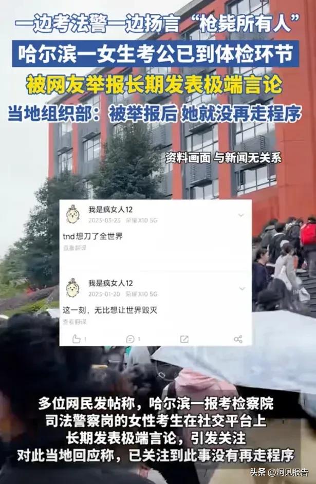还有前段时间哈尔滨考法警的那个女生,都考上法警要去体检了,结果因为有人扒出她用小号在网上发极端言论,说要“枪毙所有人”,资格也被取消了。有人替她辩解,说就是发泄情绪,没必要上纲上线。