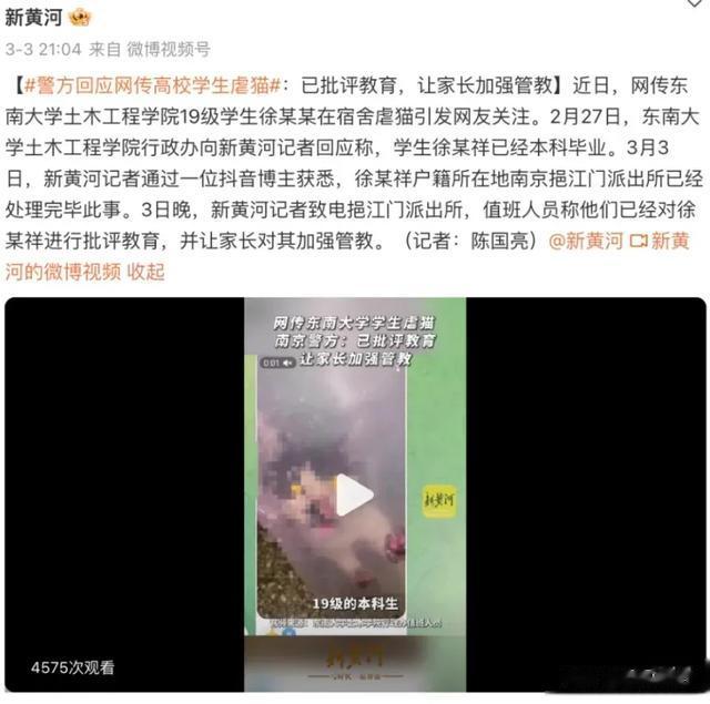 这让我想起去年南京大学研究生考试第一名的徐某某,他也是个虐猫惯犯,最后学校以“思想品格不合格”把他除名了。