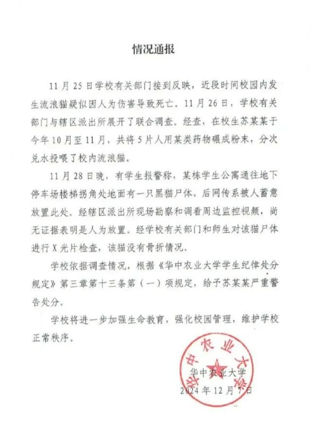 说起来这还是去年10月至11月的事,华中农业大学校园内接连发生多起流浪猫非正常死亡事件,网友怀疑是有人投毒+虐猫,因为有些猫尸体还被发现口腔里有腐蚀液,四肢都被折断了。