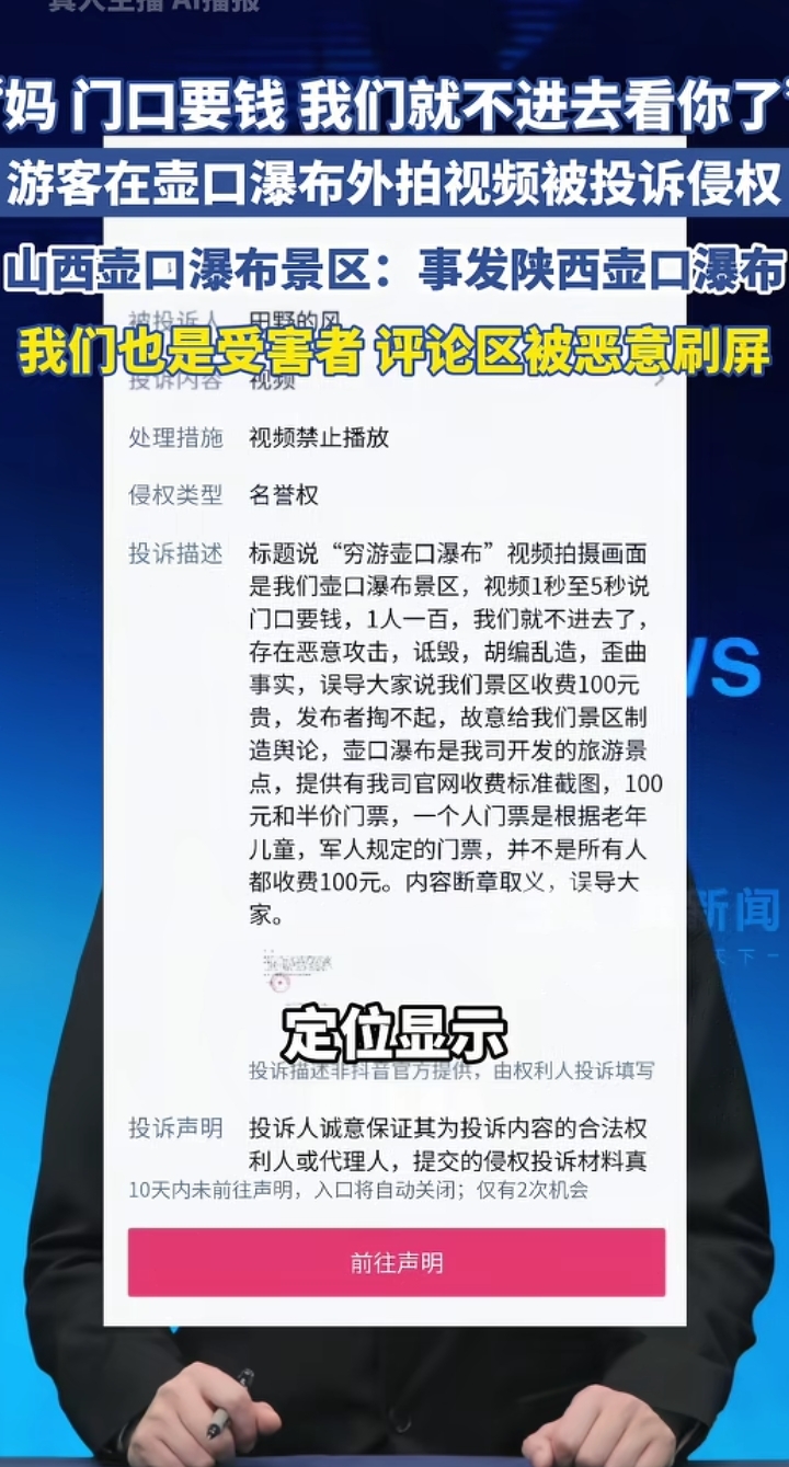 谁能想到就这么一句话把景区给惹毛了,视频刚火起来,投诉就跟着来了,称他诋毁歪曲事实,恶意攻击,还强调一句“壶口瀑布是我司开发的旅游景点”,结果就是视频被下架了,博主还被迫出来公开道歉。咱平心而论啊,这个视频有问题吗?他没有说门票1000,也没有指着大门骂街,更没有搞什么恶意剪辑,实际情况就摆在那。